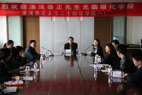 汤浅恭正教授是日本特殊教育专家、知名学者,在特殊教育领域有很深的造诣。绥化学院院长庄严对汤浅恭正教授的来访表示欢迎。他说,特殊教育是一项人道主义事业,大阪市立大学开设特殊教育历史较长,经验比较丰富,绥化学院的特殊教育才刚刚起步,希望通过汤浅恭正教授的来访,使双方建立友好合作关系,在教学科研、互派留学生等方面开展合作,共同促进特殊教育的长足发展。