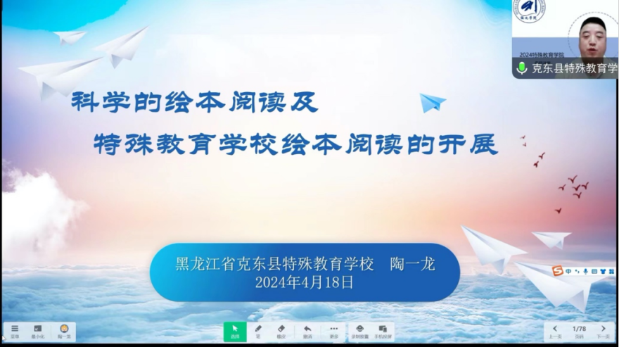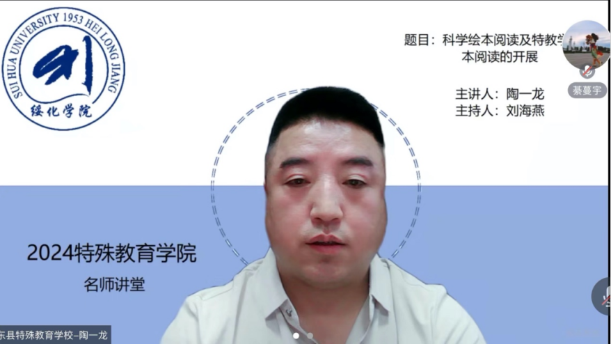 4月18日晚,克东县特殊教育学校校长陶一龙受邀为我校特殊教育学院作题为《科学的绘本阅读及特教学校绘本阅读教学的开展》的专题讲座。特殊教育学院全体教师,2021、2022级特殊教育专业和教育康复学专业学生参加培训。教师刘海燕主持本次讲座。
