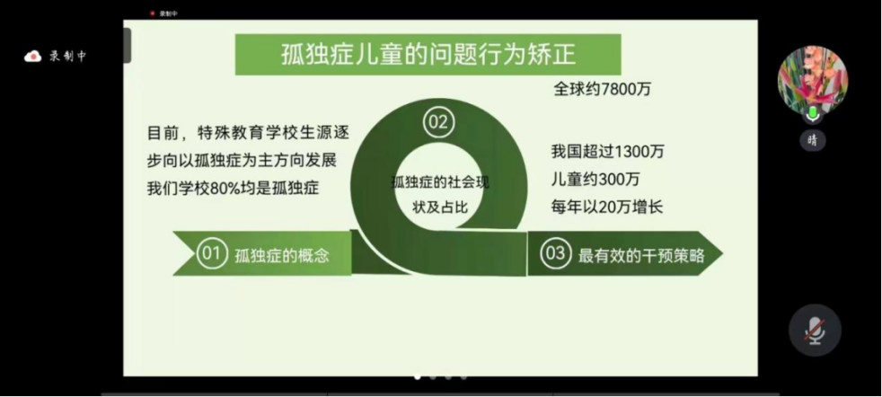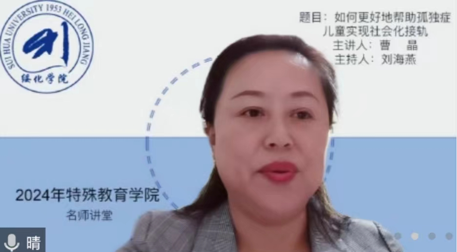 4月26日下午,伊春市特殊教育中心副校长曹晶以《如何帮助自闭症儿童实现社会化接轨》为题开展第六场讲座。特殊教育学院全体教师和2021、2022级学生参加培训。特殊教育学院教师刘海燕主持本次讲座。