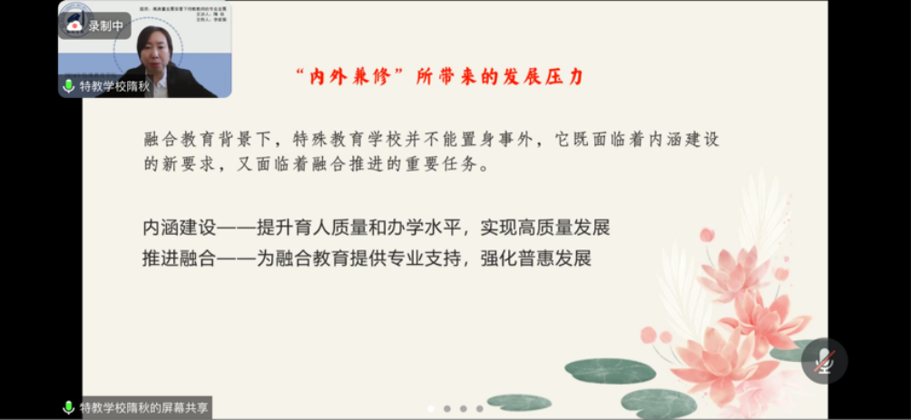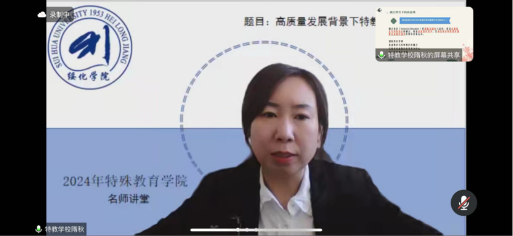 4月27日上午,大庆市特殊教育学校校长隋秋受邀为我校特殊教育学院作题为《高质量发展背景下特教教师的专业发展 》的专题讲座。特殊教育学院教师,2021、2022级全体学生参加培训。特殊教育学院教师李家菊主持本次讲座。