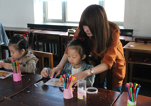 “请各位家长到隔壁的教室去休息,我们的课堂要开始了。”关老师亲切地对家长们说。首先,老师变魔术般从包里拿出一些蛋壳,通过几个问题让孩子们意识到,原来蛋壳有这么多妙用,尤其是老师制作的作品小样出现在孩子们面前后,更激起了他们的创作欲望。“孩子们歪着脑袋,一边听老师讲,一边忍不住动手实践着。挤压蛋壳,涂上颜色等一系列动作看似简单,对于那些幼儿们确实是一项挑战。纤细的小手不停在卡纸上回动,时不时帮助一旁的同学。在他们辛勤的努力下,零零碎碎的蛋壳转化成一件件精致的作品。